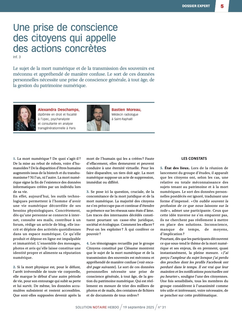 « Les traces que nous laissons derrière nous dans le monde numérique constituent une empreinte indélébile et une mémoire persistante qui dépassent notre existence physique, souligne Alexia Arno, co-fondatrice de la plate-forme Clésame. À une époque où chaque moment, chaque relation et chaque décision trouvent une place en ligne, nous n’avons que trop peu réfléchi à ce qu’il adviendra de cette existence digitale une fois la nôtre achevée. Et pourtant, cette question nous concerne tous. La mort numérique est le prolongement de la vie numérique. C’est une réalité complexe qui touche à l’intime. Un débat collectif sur ces enjeux émergents devient urgent. »